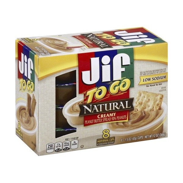 Enjoy the delicious taste of Jif Natural Peanut Butter Spread in a convenient, to-go cup. Portable, easy-to-use cups are perfect for dipping your favorite snacks or vegetables. Single-serve cups are great for portion control. Kosher pareve, low-sodium peanut butter does not require refrigeration.