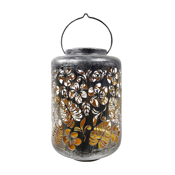 Bliss Outdoors BSL305S Solar LED Lantern w Tropical Flower Design Hand Painted Finish, 12in Tall, Waterproof IP44 Silver With the Bliss Outdoors Decorative Solar 2Mode LED Lantern, you'll cast a beautiful illuminated design that will add ambience and charm to any living, gardening, or patio space You get a large solar lantern that measures 12 tall x 775 in diameter, and has a dusk to dawn feature so it automatically illuminates at night and turns off at dawn Featuring 2 modes of light choices A steady warm LED light, or a wonderful 5 color gradual transition mode for the perfect ambience in any setting It includes a 600 mAh battery and a polycrystal solar panel that gives you 68 or running time of light when fully charged during the day for 46 hours under sunlight Designed with a tropical flower pattern that's laser cut on the lanterns surface so when illuminated, it casts a beautiful design shadow pattern that's warm and pleasant to the eye The lantern is durable and made of highquality metal, then hand painted in a gorgeous brushed antique painted finish These solar lanterns are also IP44 waterproof rated so it can withstand the element comes with a handle so you can hang it or stand it on a table It's an ideal gift for loved ones, holidays, housewarming or for anyone who wants to add a bit of charm to their living spaces Find your Bliss