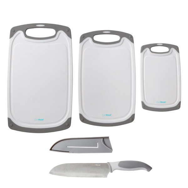 EatNeat SN211005 5Piece Cutting Board Knife Set, 3 Reversible Cutting Boards, Santoku Knife W Sheath A CUT ABOVE This 5Pc Cutting Board Knife Set, from EatNeat, will be right at home in any kitchen The 3 stylish, reversible, reusable polypropylene cutting boards are dishwashersafe for quick, easy cleanup, and feature nonslip rubber borders, sturdy handles, and deep juice grooves to keep juice and bits of chopped food from spilling onto tables and countertops Plus, the ultrasharp, 7 Santoku Knife with protective sheath cuts, chops, slices, and dices like a dream thanks to its nonstick coating and secure, softgrip handle