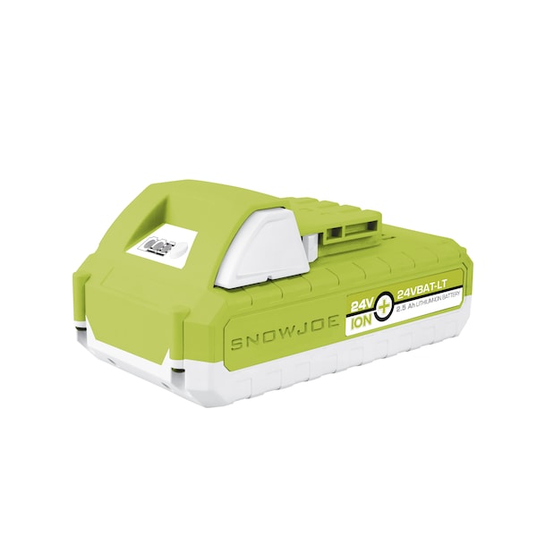 Power up. Power your cordless iON tools the eco-friendly way with the 24-Volt iON+ 24VBAT-LT lithium-ion battery. Compatible with all Snow Joe® + Sun Joe® 24V iON+ models, the 24VBAT-LT features high capacity 2.5 Ah lithium-ion cells that deliver no-fade power for maximum job performance.Simply insert iON+ LITE into your 24-volt tool of choice and power up instantly without having to mess with gas, oil, pull-cords, or tangled extension cords!