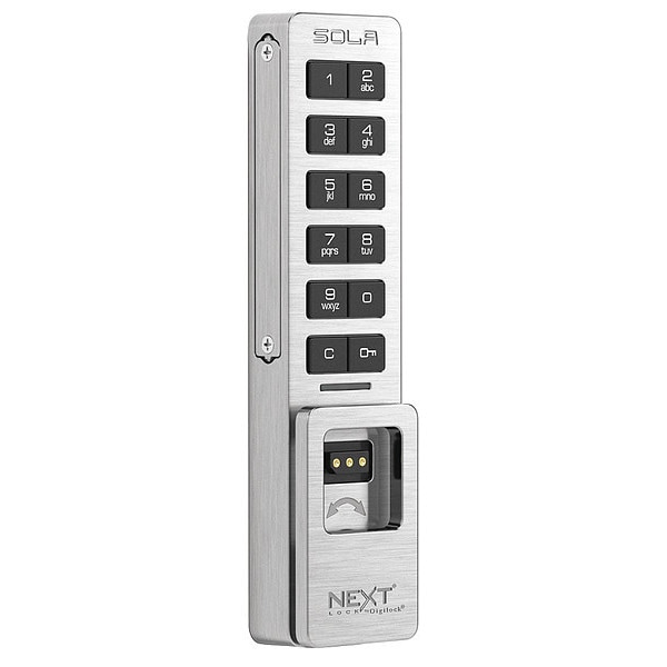 Electronic Keyless Lock, For Use With Cabinet Doors, Lockers, Access Method Keypad, Usage Assigned, Shared, Handle Type Thumb Turn, Door Thickness 0.03 in to 1.57 in, Lock Material Zinc, Finish Brushed Nickel, Series Sola 3, Hand Right Hand, Outside Height 5.24 in, Outside Depth 0.61 in, Outside Width 1.24 in, Latch Length 0.35 in to 1.70 in, Keypad Material Plastic, Number of Keys on Keypad 12, Timed Entry Allowance 6 sec, Features Audible Indicator, Auto Unlock, Code Managed