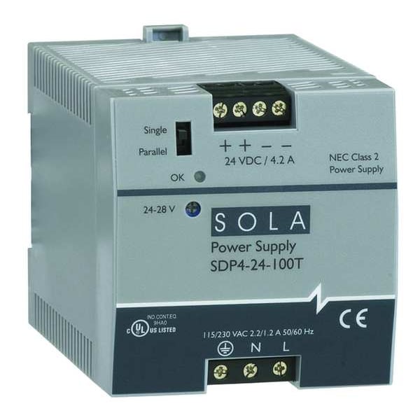 DC Power Supply, Input Voltage 176 to 264V AC, 85 to 132V AC, Output Voltage 24 to 28V DC, Power Rating 100W, Output Amps 3.8, Mounting DIN Rail, Switching, Case Material Plastic Case, Height 2.95 in, Width 2.85 in, Depth 3.8 in, Series SDP, Hz 60 Hz, Phase - Electrical Single, IP Rating IP20, Output Noise Less Than 50mV, Hold Up Time Greater Than 25 msec, Status Indicator Green LED, NEMA Rating 1