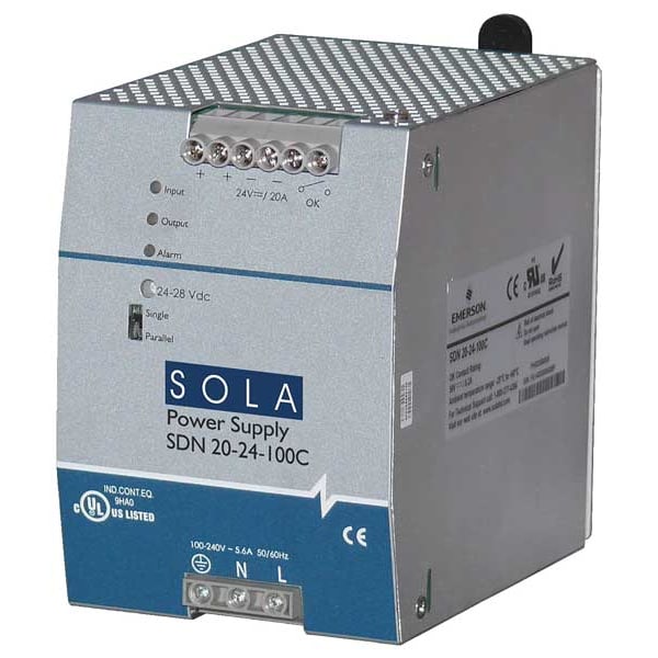 DC Power Supply, Input Voltage 100 to 240V AC, Output Voltage 24V DC, Power Rating 480W, Output Amps 20, Mounting DIN Rail, Switching, Case Material Metal Case, Height 4.85 in, Width 3.42 in, Depth 4.98 in, Series SDN-C, Hz 60 Hz, Phase - Electrical Single, Peak Amps 22, IP Rating IP20, Output Noise Less Than 100mV, Hold Up Time Greater Than 20 msec, Status Indicator LED