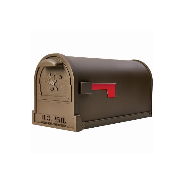 Arlington large T2 bronze premium post mount mailbox. Constructed from high-quality galvanized steel and compression molded plastic it provides a long-lasting service life. Its compression heavy duty molded plastic door features an embossed eagle and the text U.S. Mail. A roller catch door latch keeps the mailbox securely closed. The large capacity easily accommodates envelopes magazines padded envelopes and small to medium sized packages. Available in either a textured black or bronze finish both are powder-coated to withstand rust and the elements.