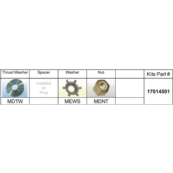 Propeller hardware kit. For Solas Dual Prop and B3 installations, front and rear propellers must both be manufactured by Solas. Also, they must be made of the same material: either aluminum or stainless steel but not both. Special tools may be required to install Dual Props. Please consult OEM manual for proper installation and torque specs. Disclaimer: Pitch estimates and propeller selections made by this prop finder are provided only as a general reference and may not be correct for specific boats under actual boating conditions. By using this prop finder, you agree that the Solas Science and Engineering Company, Ltd, its dealers and other host entities do not accept any liability and are not responsible for harm to persons or property, damages or costs caused by the installation, handling or use of an indicated propeller or hardware. Refer to your engine's Owners Manual for important safety precautions when installing a propeller. A new propeller's hub and blades must be checked for sufficient lower unit and trim tab clearances before use. Engine manufacturer recommends greasing the propeller shaft every 12 months. Wide open throttle RPM, with boat on the water in forward gear under normal loading conditions, should fall within the range that is recommended by the engine manufacturer and not exceed the recommended maximum. This is important in determining a suitable propeller pitch. When in doubt, dealer assistance is suggested. Type: D; Application: 40-140 HP . Type: D. Application: 40-140 HP. Model: 17014501.