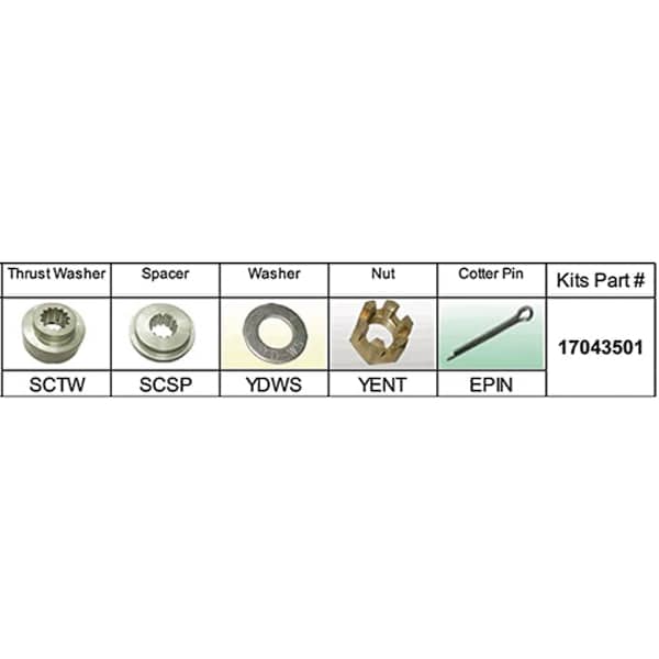 Propeller hardware kit. For Solas Dual Prop and B3 installations, front and rear propellers must both be manufactured by Solas. Also, they must be made of the same material: either aluminum or stainless steel but not both. Special tools may be required to install Dual Props. Please consult OEM manual for proper installation and torque specs. Disclaimer: Pitch estimates and propeller selections made by this prop finder are provided only as a general reference and may not be correct for specific boats under actual boating conditions. By using this prop finder, you agree that the Solas Science and Engineering Company, Ltd, its dealers and other host entities do not accept any liability and are not responsible for harm to persons or property, damages or costs caused by the installation, handling or use of an indicated propeller or hardware. Refer to your engine's Owners Manual for important safety precautions when installing a propeller. A new propeller's hub and blades must be checked for sufficient lower unit and trim tab clearances before use. Engine manufacturer recommends greasing the propeller shaft every 12 months. Wide open throttle RPM, with boat on the water in forward gear under normal loading conditions, should fall within the range that is recommended by the engine manufacturer and not exceed the recommended maximum. This is important in determining a suitable propeller pitch. When in doubt, dealer assistance is suggested. Type: C; Application: 35-65 HP . Type: C. Application: 35-65 HP. Model: 17043501.
