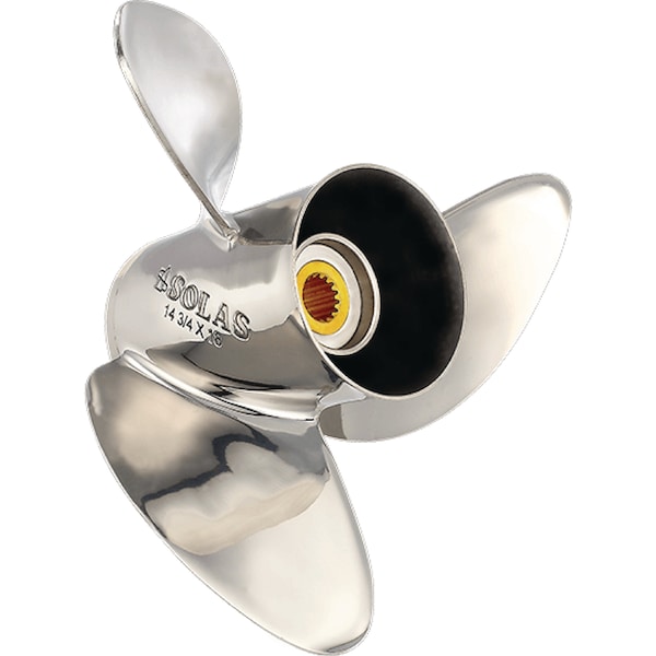 Traditional Rubber hub. All-around performance. Good acceleration. Large ear blade design. Visit www. rubexprops. com for application information. For Solas Dual Prop and B3 installations, front and rear propellers must both be manufactured by Solas. Also, they must be made of the same material: either aluminum or stainless steel but not both. Special tools may be required to install Dual Props. Please consult OEM manual for proper installation and torque specs. Disclaimer: Pitch estimates and propeller selections made by this prop finder are provided only as a general reference and may not be correct for specific boats under actual boating conditions. By using this prop finder, you agree that the Solas Science and Engineering Company, Ltd, its dealers and other host entities do not accept any liability and are not responsible for harm to persons or property, damages or costs caused by the installation, handling or use of an indicated propeller or hardware. Refer to your engine's Owners Manual for important safety precautions when installing a propeller. A new propeller's hub and blades must be checked for sufficient lower unit and trim tab clearances before use. Engine manufacturer recommends greasing the propeller shaft every 12 months. 3 Blades; 14.75 in. Dia.; 19 in. Pitch. 15 in. Spline Tooth . Right Rotation; Material: Stainless Steel . Quality and commitment.