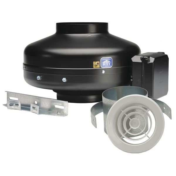 In-Line Duct Fan, For Fan Type Dryer Booster Kit, Airflow @ 0.000 in SP 153 cfm, Duct Diameter 4 in, Motor Output Power 84 W, Motor IP Rating IP44, Nameplate Voltage 120V AC, Phase 1, Number of Speeds 1, Overall Diameter 7 3/4 in, Overall Height 7 5/8 in, Overall Width 9 1/2 in, Application General Purpose, High-Efficiency Motor No, Housing Material Galvanized Steel, Motor Speed 2,880 RPM, Includes Intake Grill, Mounting Bracket, Maximum Inlet Air Temperature 140 Degrees F