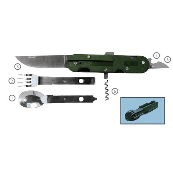 The 6-in-1 Camping Multi-Tool by Sona is all you will need for eating utensils whil camping, hiking, picnicing or for other outdoor activities. Features a knife, fork, spoon, corkscrew, and can and bottle opener. Includes a nylon carrying case with belt loop.Dimensions: Length:10.25 Height:1 Width:10.25