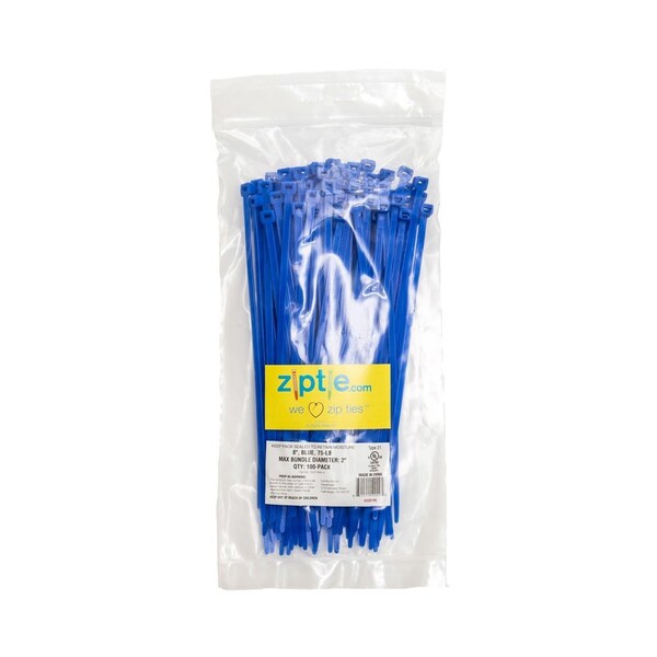 Cable Tie, 8 in L, 2 in Max Bundle Dia., Blue, Nylon, 75 lb Strength, 100 PK