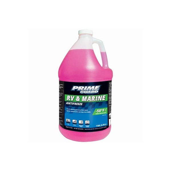 Prime Guard Gallon -50 Degrees RV Antifreeze 100% Propylene Glycol Formula Ideal For Trailers Boats Mobile Homes Cottages Swimming Pools RVs & Safe For Fresh Water Systems Protects To - 50 Degrees Fahrenheit -46 Degrees Celsius Safe Odorless Tasteless No Mixing Required High Grade For Complete Freeze Protection All Ingredients Are Listed In US Federal Register GRAS.