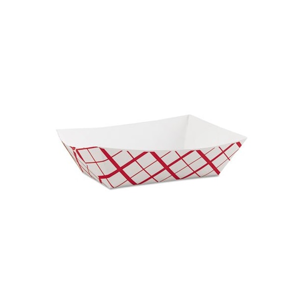 Serve everything from burgers to barbecue in classic checkerboard baskets. Coated paperboard keeps sauces, grease and oils from tabletops and clothing. Stackable, nestable design enables space-saving storage. 3 lb Capacity. Food Container Type: Tray; Materials: Paperboard; Food Container Material Type: Paper; Colors: Red/White.