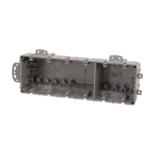 Romex Multi-Mount Outlet Box, Conduit Cable Entry, 16 Knockouts, 1/2 in Knockout, 6 Gangs, Rectangular Shape, 110 cu-in, Dimensions: 3.5 in H x 3.8 in W x 12.5 in D, Polycarbonate, Gray, Wall Mounting