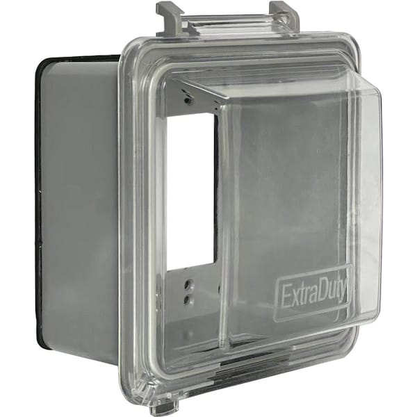 Weatherproof while-in-use cover that is efficient and built to last. The 31-in-1 cover features different configuration options to suit multiple applications. Constructed of high impact polycarbonate and UV protection. ETL compliant for use in wet locations. NEC and NEMA 3R compliant. Extra-duty rated. Clear cover and gray base.