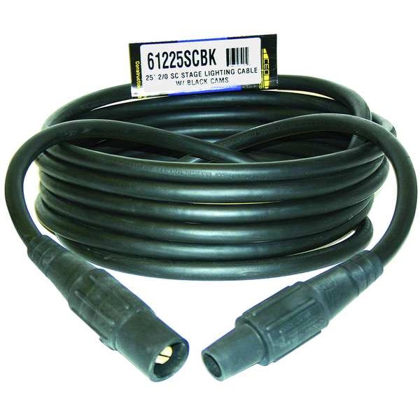 Cam Lock Power Cable, Max. Amps 200 A, Voltage Rating 600V AC, Connector End CL20FBK, Plug End CL20MBK, Number of Poles 1, Number of Wires 1, Wire Size 2/0 AWG, Color Black, Cord Length 25 ft, For Use With Distribution Cart, Standards CUL, UL Listed