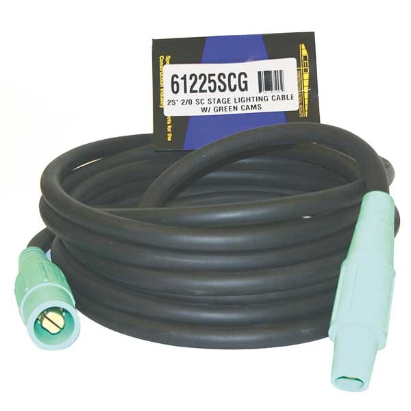 Cam Lock Power Cable, Max. Amps 200 A, Voltage Rating 600V AC, Connector End CL20FG, Plug End CL20MG, Number of Poles 1, Number of Wires 1, Wire Size 2/0 AWG, Color Green, Cord Length 25 ft, For Use With Distribution Cart, Standards CUL, UL Listed