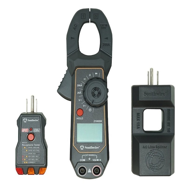 Clamp meter kit consisting of Southwire's new 200 A AC clamp meter, easy-to-use 120 VAC receptacle tester with GFCI test and a convenient AC line splitter for measuring current on common household plug-in appliances.