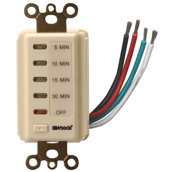 Set a running time for bathroom exhaust fans or lighting. Replaces a standard light switchplate and fits a standard decorator switchplate. Compatible with compact fluorescent bulbs. 120 VAC 60 Hz 15 A, 1875 W resistive, 8 A, 120 V, 1000 W Tungsten 1/4 hp. cUL listed.