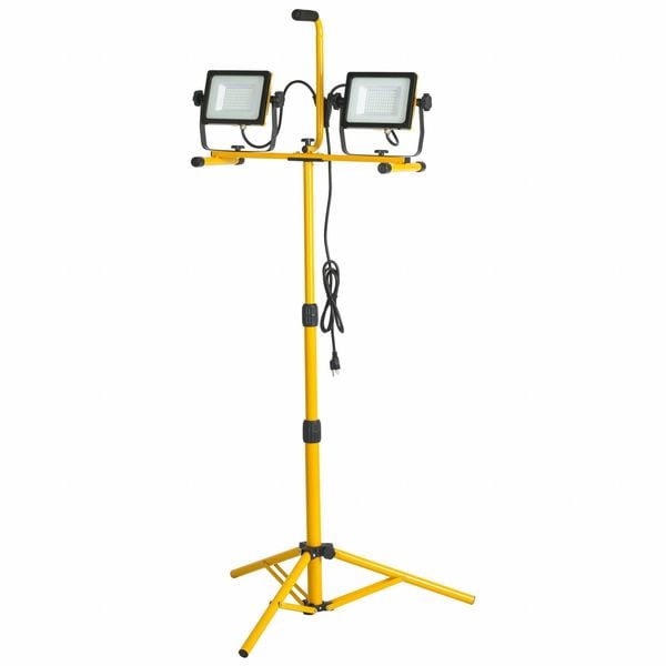 Dual Head Work Light, Power Source Corded, Battery Chemistry Not Applicable, Maximum Run Time Not Applicable, Maximum Brightness 10,000 lm, Number of Brightness Levels 1, Power Cord Length 6 ft, Operating Voltage 120V AC, Lighting Technology LED, Number of Lamp Heads 2, Mount Type Tripod, Frame Color Black/Yellow, Hazardous Location Specification Not Rated, IP Rating Not Rated, Maximum Height Adjustment 48.5 in, Color Rendering Index Not Applicable, Includes Bulb Yes, Brightness Levels 5,000 lm