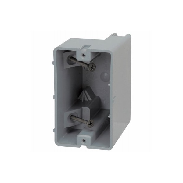 Southwire 1 Gang Device Box Mounts to wood or metal stud 25 g Step down feature allows for wire entrance in both top and bottom of box Heavyduty 42 lbs mounting screws supplied Adjustable depth Extra thick PVC wall material creates stability and rigidity Builtin wire clamps All 632 device holes are threaded RoHS compliant UL liste Material PVC