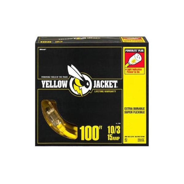 Yellow Jacket, 15A, 10 Gauge, 100' Extension Cord, Power Light Indicator Plug Glows When The Cord Has Power, Extra Heavy, Clear Molded Plugs Are Rugged, Durable Oversized