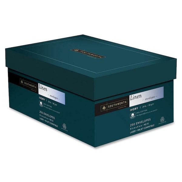 No. 10 envelopes capture the rich texture and feel of natural linen. Richly textured, 25 percent cotton fiber is ideal for use with letterheads, reports and presentations where a distinctive look is a must. 24 lb. envelopes are watermarked, acid-free, and compatible with laser and inkjet printers. Envelopes are made with a high percentage of recycled material.