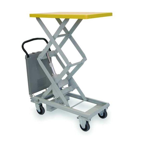 Powered, Lift Mechanism Linear Actuator, Lift Control Push Button, Load Capacity 220 lb, Platform Material Steel, Platform Length 36 in, Platform Width 24 in, Overall Length 42 in, Overall Width 24 in, Overall Height 37 1/2 in, Minimum Lifting Height 13 in, Maximum Lifting Height 51 in, Scissor Type Dual, Wheel Configuration (2) Swivel , (2) Rigid with Floor Lock, Brake Type Floor Lock, Platform LxW 36 in x 24 in