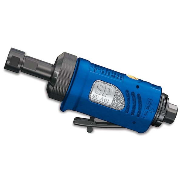The SP-7220 by SP Air Corporation is a 1/4" heavy-duty straight die grinder. An ergonomically designed cusion-grip handle provides added comfort during operation. The unit comes equipped with a rear exhaust, a built-in power regulator, a safety throttle lever, a direct drive motor and a graduated trigger. Unit specifications include a free speed of 20,000 rpm, a required air pressure of 90 psi, average air consumption of 4.0 cfm, an air inlet size of 1/4",