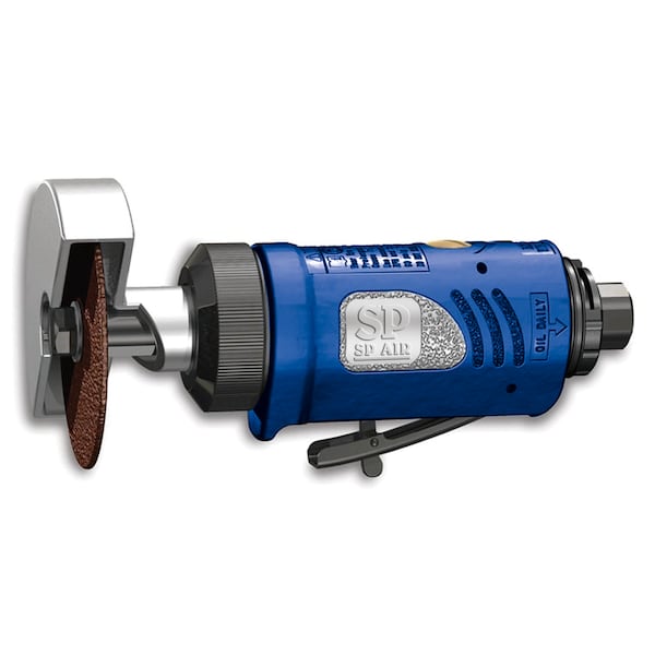 The SP-7230 by SP Air Corporation is a Cut off tool with a disc size of 3". The unit has an ergonomic design with a cushion-grip handle for added comfort during operation. It is equipped with a rear exhaust and safety-throttle lever as well as a direct motor drive. The trigger is graduated for power control and a metal guard is present for added safety. Unit specifications include a free speed of 20,000 rpm, a required air pressure of 90 psi, average air consumption of 4.0 cfm, an air inlet size of 1/4"