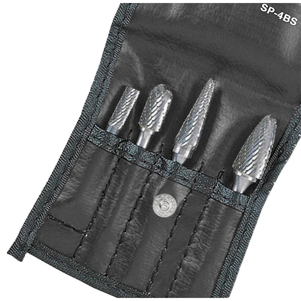 SP Air Corporation 4-piece Carbide Burr SET. These burrs features and notes are use with 1/4" high speed die grinders, removes burrs from sheet metal or cast iron, use in metalworking, mold and pattern making, die sinking, surface cleaning and maintenance and cleans up welded areas.