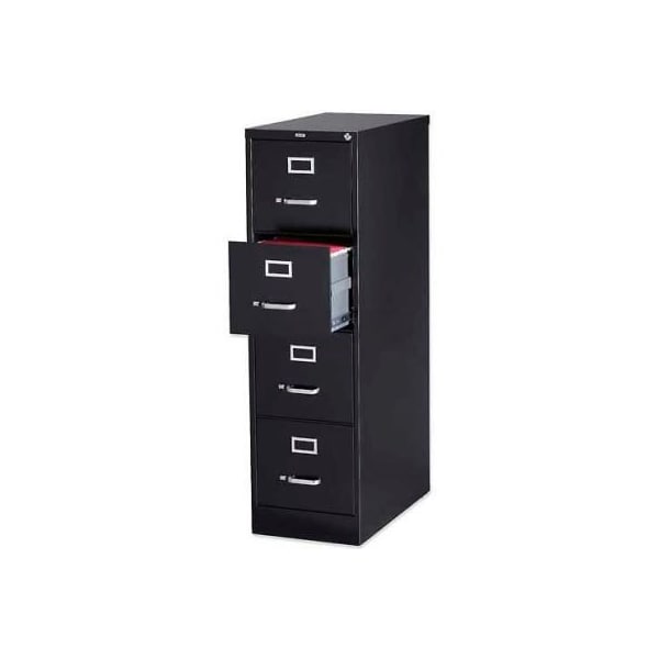 Lorell 4-drawer heavy duty vertical file cabinet, 15"w x 26-1/2"d x 52"h, black commercial-grade vertical file features four high-sided drawers that accommodate letter-size, hanging file folders without additional accessories. Three-piece, slide suspension allows maximum drawer extension. Steel ball bearings provide smooth, quiet drawer performance. Vertical file also features a core removable lock, adjustable wire followers and heavy-duty steel construction. Vertical file meets or exceeds ansi/bifma industry standards. features security lock ball-bearing suspension heavy duty