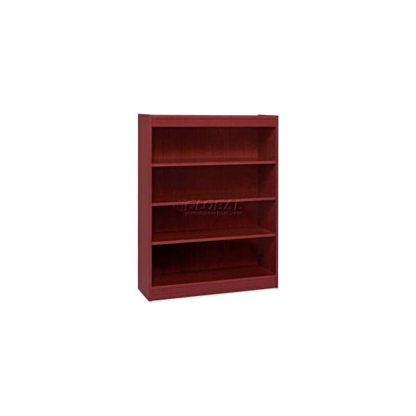 Lorell 4-shelf panel end hardwood veneer bookcase, 36"w x 12"d x 48"h, mahogany high-quality, veneer bookcase features a vintage square design. Solid, 3/4" thick shelves are adjustable on 1-3/4" centers with pinhole attachments, except for bottom shelf. Four-shelf bookcase has a laminated finish on the back's interior and an unfinished back side. Each shelf holds up to 110 lb.