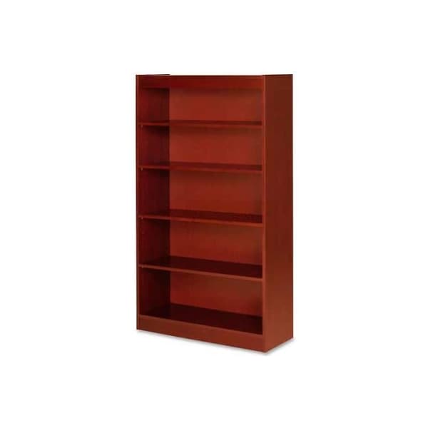 Lorell 5-shelf panel end hardwood veneer bookcase, 36"w x 12"d x 60"h, cherry high-quality, veneer bookcase features a vintage square design. Solid, 3/4" thick shelves are adjustable on 1-3/4" centers with pinhole attachments, except for bottom shelf. Five-shelf bookcase has a laminated finish on the back's interior and an unfinished back side. Each shelf holds up to 110 lb.