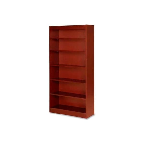 Lorell 6-shelf panel end hardwood veneer bookcase, 36"w x 12"d x 72"h, cherry high-quality, veneer bookcase features a vintage square design. Solid, 3/4" thick shelves are adjustable on 1-3/4" centers with pinhole attachments, except for bottom shelf. Six-shelf bookcase has a laminated finish on the back's interior and an unfinished back side. Each shelf holds up to 110 lb.