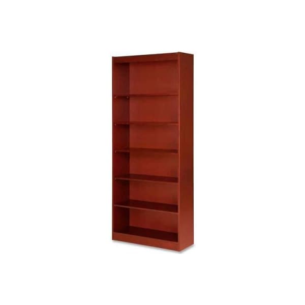 Lorell 7-shelf panel end hardwood veneer bookcase, 36"w x 12"d x 84"h, cherry high-quality, veneer bookcase features a vintage square design. Solid, 3/4" thick shelves are adjustable on 1-3/4" centers with pinhole attachments, except for bottom shelf. 7-shelf bookcase has a laminated finish on the back's interior and an unfinished back side. Six shelves are adjustable, and the bottom shelf is fixed. Each shelf holds up to 110 lb.