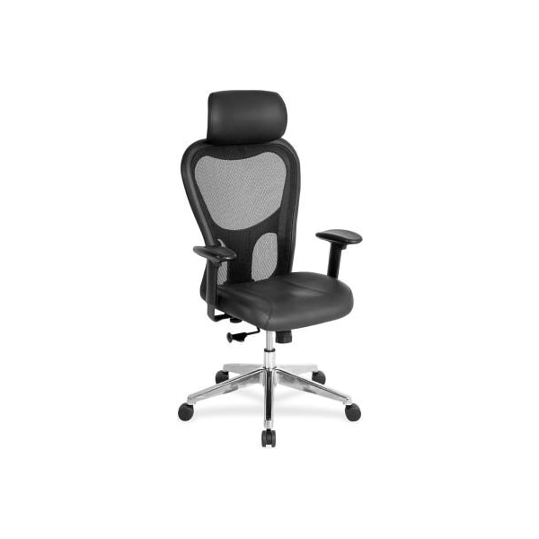 Lorell high-back executive chair, 25"w x 23-5/8"d x 53"h, black leather seat/mesh back executive high-back chair features a headrest, black mesh back, black leather seat and arm pads. Functions include pneumatic seat-height adjustment, 360 swivel, tilt tension and tilt lock. Frame and five-star base are made of polished aluminum. Base has casters for easy chair movement. features headrest pneumatic adjustment 360 swivel tilt lock tilt tension