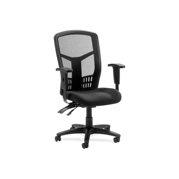 Lorell high-back executive chair, 28-1/2"w x 28-1/2"d x 45"h, black fabric seat/mesh back executive high-back chair features a mesh back chair, mesh fabric seat and ergonomically designed high back for the natural curvature of a person's back. Arms adjust in height and width. Seat height from floor adjusts from 17" to 21". High-back chair offers a nylon five-star base, pneumatic seat-height adjustment, 360 swivel, tilt and asynchronous three-lever control. High-back chair is available in black frame only and meets the ca117 fire-retardant standard. features 360 swivel adjustable arms pneumatic adjustment tilt tension tilt mesh back ergonomic design seat height adjustment
