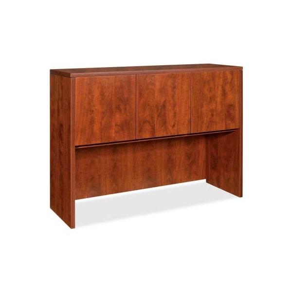 Lorell 69000 series hutch with doors, 48"w x 17"d x 36"h, cherry hutch with three doors is part of lorell 69000 series laminate furniture with high-quality laminate construction and metal-to-metal cam-lock connections. Hutch easily attaches onto 48" wide desks or credenzas in this collection. Design includes one grommet for easy cord management, mahogany laminate surfaces for durability, backing and 3mm pvc edge banding. features grommet cord management view the essentials collection here.