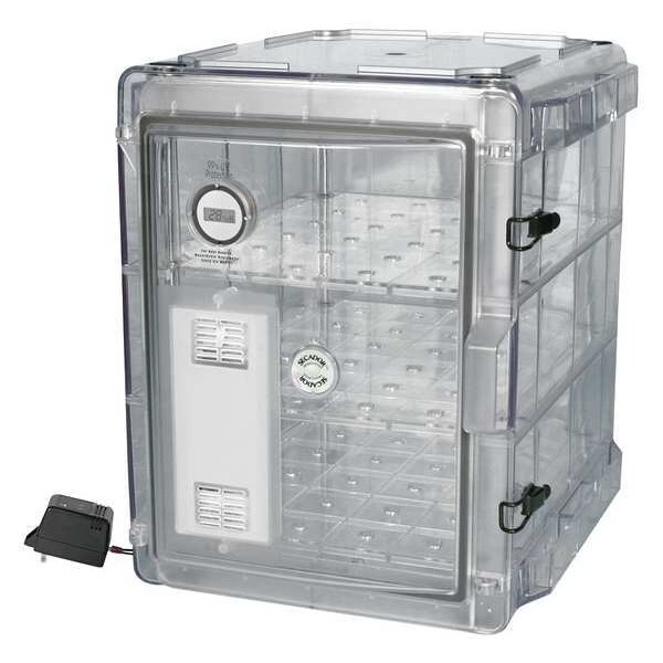 Cabinet Desiccator, Type Cabinet Desiccator, Overall Height 16 3/8 in, Overall Length 16 1/4 in, Overall Width 13 3/8 in, Number of Shelves 3, Plate Height 4-3/8 in, Lab Desiccator Material Co-Polyester, Color Clear, Inside Height 13 1/2 in, Inside Width 11 1/2 in, For Use With 230V, CE Certified, Fully Automatic, Verticle Profile, Includes Lid