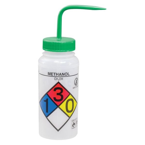 Wash Bottle, Capacity - Metric 500 mL, Imprinting Methanol, Capacity - English 16 fl oz, Basic Material Plastic, Body Material LDPE, Vented/Nonvented Vented, Closure Material Polypropylene, Spout Style Standard Spout, Product Type Wash Bottle, Body Color White, Body Diameter 53 mm, Closure Color Green, Autoclavable No, Closure Included Yes, Mouth Size Wide, Clarity Translucent, Closure Style Screw On, Numbers of Bottles Included 4, Standards 29 CFR 1910.1200, OSHA, Package Quantity 4