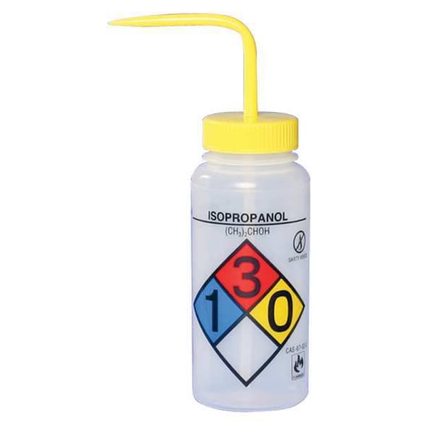 Wash Bottle, Capacity - Metric 500 mL, Imprinting Isopropanol, Capacity - English 16 fl oz, Basic Material Plastic, Body Material LDPE, Vented/Nonvented Vented, Closure Material Polypropylene, Spout Style Standard Spout, Body Color Clear, Body Diameter 53 mm, Closure Color Yellow, Autoclavable No, Mouth Size Wide, Clarity Translucent, Package Quantity 4