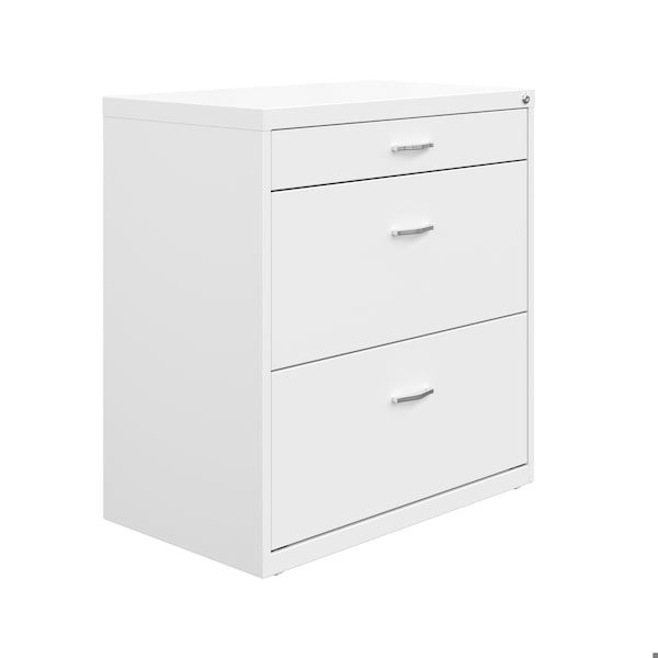 The 3 Drawer Lateral File Cabinet is perfect for storing files, supplies, and accessories for your home or office. Featuring two file drawers and a small storage drawer. Each drawer features high-sides to accommodate letter or legal sized hanging files. The top pencil drawer is the perfect storage for other office supplies. The drawers have a smooth open and close. The sleek chrome arc pull handle adds a touch of sophistication. In addition, you can keep your files and possessions secure by using the built-in lock. Painted steel surface is non-porous and easy to clean. Bring organization and function to your home or office.