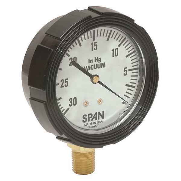 Industrial Vacuum Gauge, Nominal Dial Size 2 1/2 in, Accuracy +/-1.0 Percent, Gauge Case Material Zytel Nylon, Process Connection Type NPT, Process Connection Gender Male, Lens Material Acrylic, Process Connection Size 1/4 in, Field Fillable No, Process Connection Location Bottom, Case Color Black, IP/NEMA Rating IP65, NEMA 4X, Primary Pressure Range 30 to 0, Dry Dampening Feature None, Vibration Resistance Liquid-Filled, Dial Color White, Pressure Gauge Type Industrial Pressure Gauge