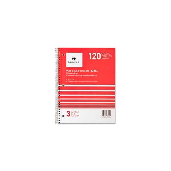 Sparco 3-subject notebook, 8" x 10-1/2", college ruled, bright white, 120 sheets/pad wirebound notebook features a stiff cover and back and kraft dividers. Bright white sheets are college-ruled and offer a 16 lb. Weight. Notebook contains 120 sheets.