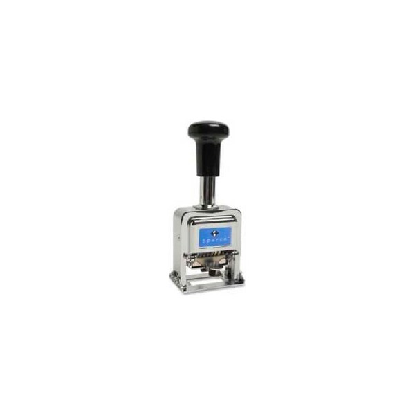Sparco self-inking automatic numbering machine, 5 wheels, 5/32" x 3/4", black/chrome sturdy, heavy-duty numbering machine is made of all-metal components. Design features seven movements to number consecutive, duplicate, triplicate, quadruplicate, sextuplicate, repeat and 12 times. Numbering machine includes ink.