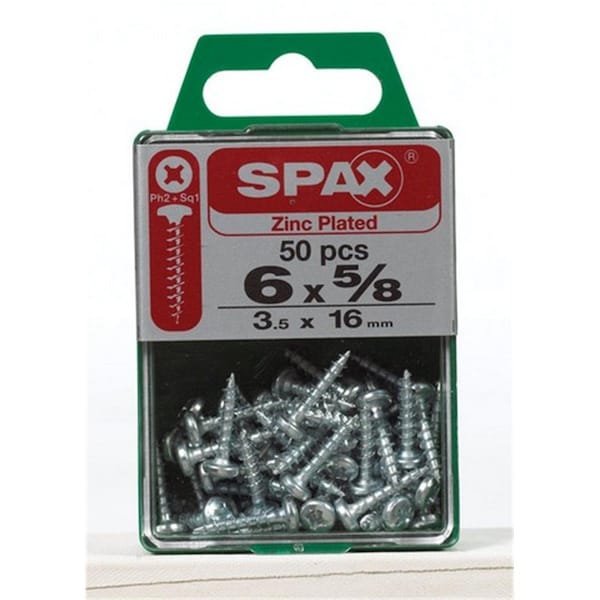Features Head Type: Pan Product Type: Multi-Material Screw Callout Size: No. 6 Screw Length: 5/8 in. Finish: Zinc Material: Steel Number in Package: 50 pk Drive Type: Phillips/Square Thread Type: Coarse