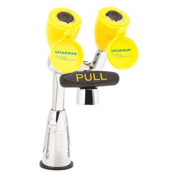 Eyewash, Eye Wash and Shower Mounting Deck, Eye Wash Bowl Material No Bowl, Spray Head Material Plastic, Eye Wash Activates By Pull Handle, Eye Wash Covering No, Assembled, ADA Compliance Yes, ANSI Compliant Yes, Number of Heads 2, Chrome, Yellow