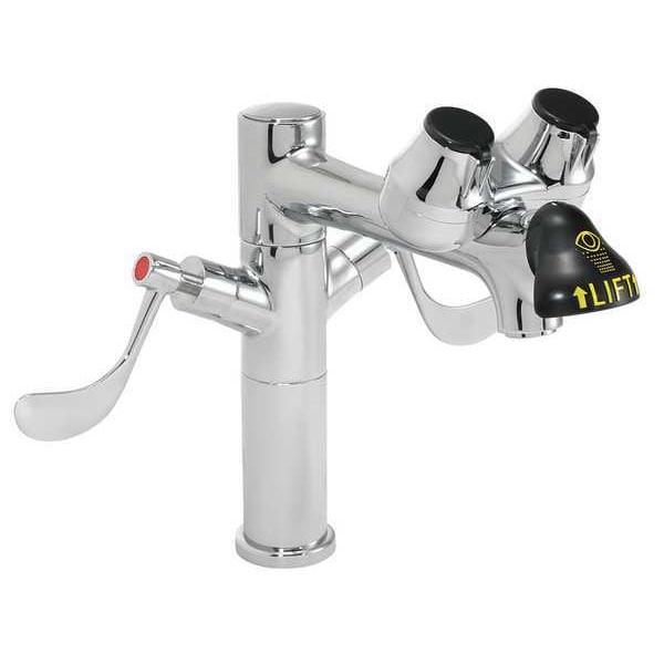 Plumbed Eyewash, Activation Pull Down, Bowl Style Uncovered, Color Silver, Coverage Eyes and Face, Depth 15 in, Height 8 1/4 in, Width 12 in, Environment General Purpose, Hazardous Location Rating Not Rated, Includes 4 in Wrist Blade Handles, Flip-Top Dust Caps with Interval Flow Controls, 8 in L Spout, Universal Emergency Sign, Inlet Pipe Gender Female, Inlet Pipe Size 1/2 in, Inlet Pipe Thread Type NPT, Pipe Material Brass, Mount Type Counter, ADA Compliant No, Mounting Style Standard