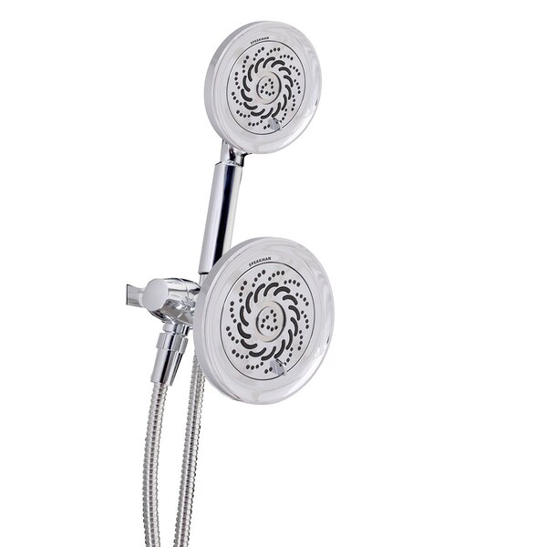 Experience the Neo Exhilaration Dual Shower Head transforming your bathroom into a spa with the combination fixed and handheld showers. Immerse yourself in the 688 distinct streams and 25 combined settings when enjoying the fixed and handheld showers simultaneously. The showers boast the patented reaction spray for a truly exceptional and premium shower. The reaction spray delivers a powerful, turbine driven full body spray that is paired with the additional settings of massage, satin, rain and pause. Enjoy the variety of personalizing your shower to meet the current need from gentle satin spray to full coverage drenching rain or a combination of both, this shower will exhilarate your senses. Easily rinse soap from thick hair, soothe your aching muscles or gently wash pets and children. The pause mode will help maintain your temperature setting and conserve water while you lather or shave. The convenience of the personalized shower experience is yours with the Neo Exhilaration Dual Shower Head the 3-in-1 diverter allows the ability to select using one of the shower heads at a time or both together. The handheld will help you maximize in shower mobility and convenience with the included 5 ft hose helping to tackle in shower cleaning, children, or pets.
