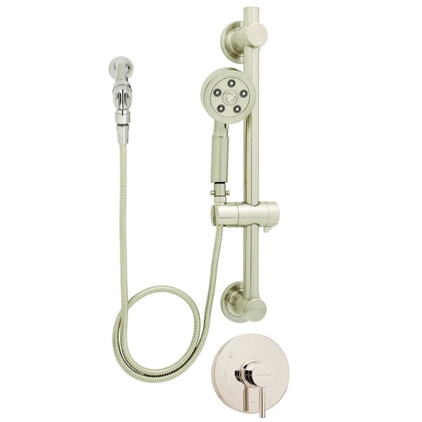 The Neo Trim and Handicap Shower System lend bold styling to a sleek look. The trim and handicap shower system pairs perfectly with the Neo collection of faucets and other bathroom accessories. The Neo Trim and Handicap Shower System exemplifies Speakman's quality standard through uniting its Shower Valve Trim (CPT-1001) with the Neo Hand Held Anystream 2.5 GPM Shower Head (VS-3010), Neo Shower Arm and Flange (S-2540), Pause/Trickle Adaptor (VS-156) and 24 in. ADA Slide Bar (VS-153-ADA). Valve is not included and must be purchased separately. The trim can be paired with either Speakman's Pressure Balancing Valve (CPV-PB) or Thermostatic Valve (CPV-T) in three connection types.